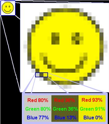 Bez zastosowania kompresji kolor każdego piksela jest definiowany pojedynczo. Obrazki z głębią kolorów RGB często składają się z kolorowych kwadratów zdefiniowanych przez trzy bajty – jeden bajt (czyli 8 bitów) na kolor czerwony, jeden na zielony i jeden na kolor niebieski. Mniej kolorowe obrazki potrzebują mniej informacji na piksel, np. obrazek w kolorach czarnym i białym wymaga tylko jednego bitu na każdy piksel (bitmapa). Grafika rastrowa różni się od wektorowej tym, że grafika wektorowa pokazuje obraz używając obiektów geometrycznych, takich jak krzywe czy wielokąty.